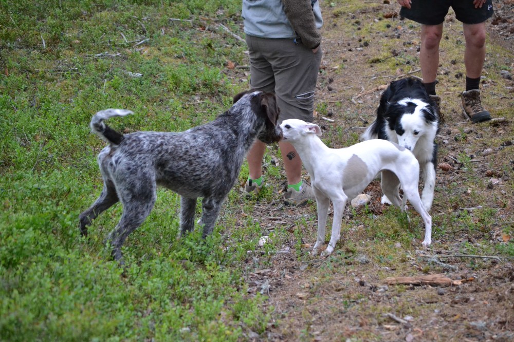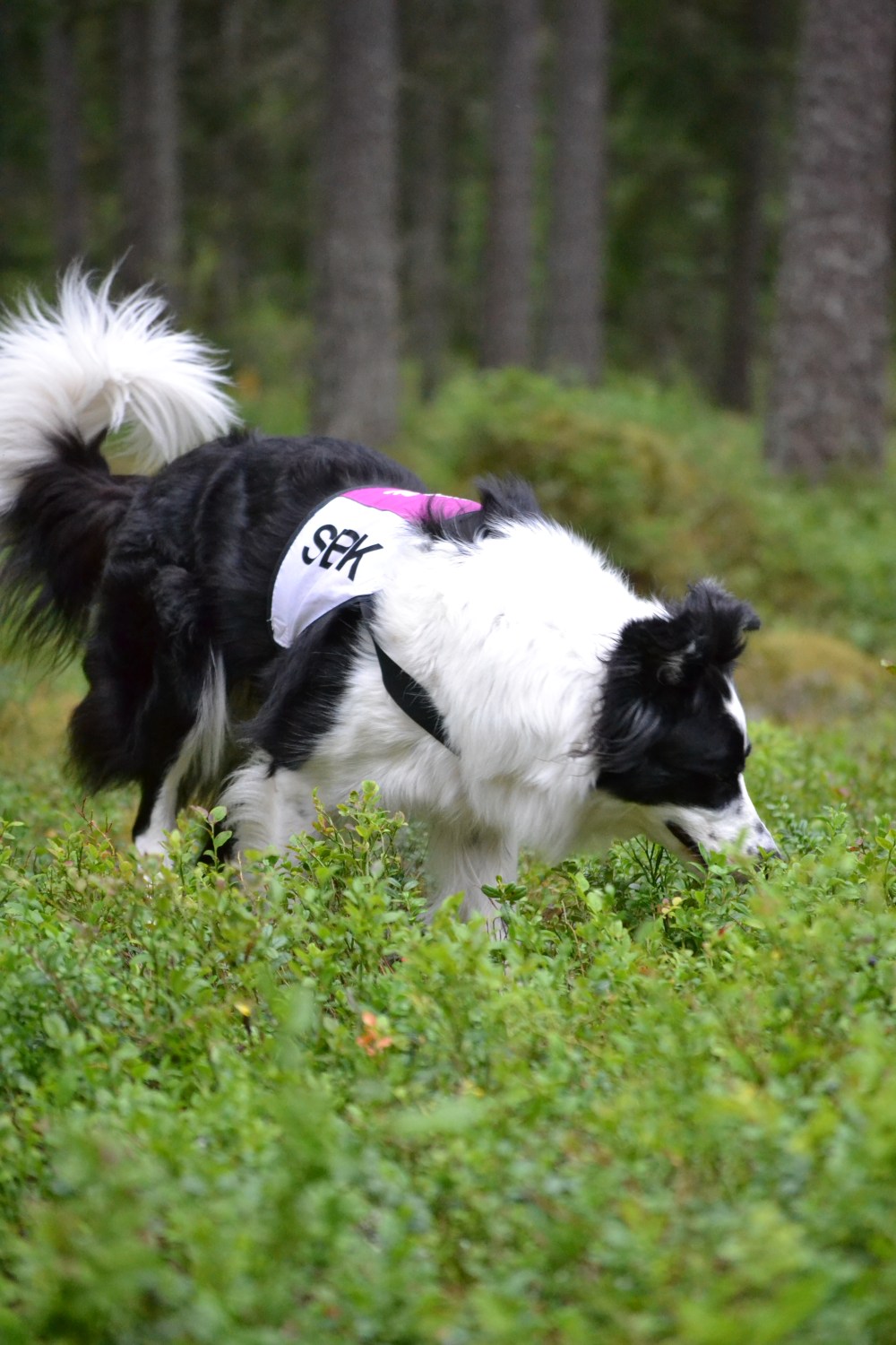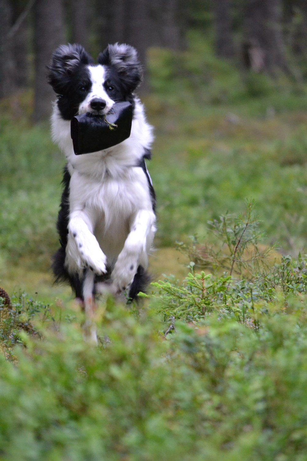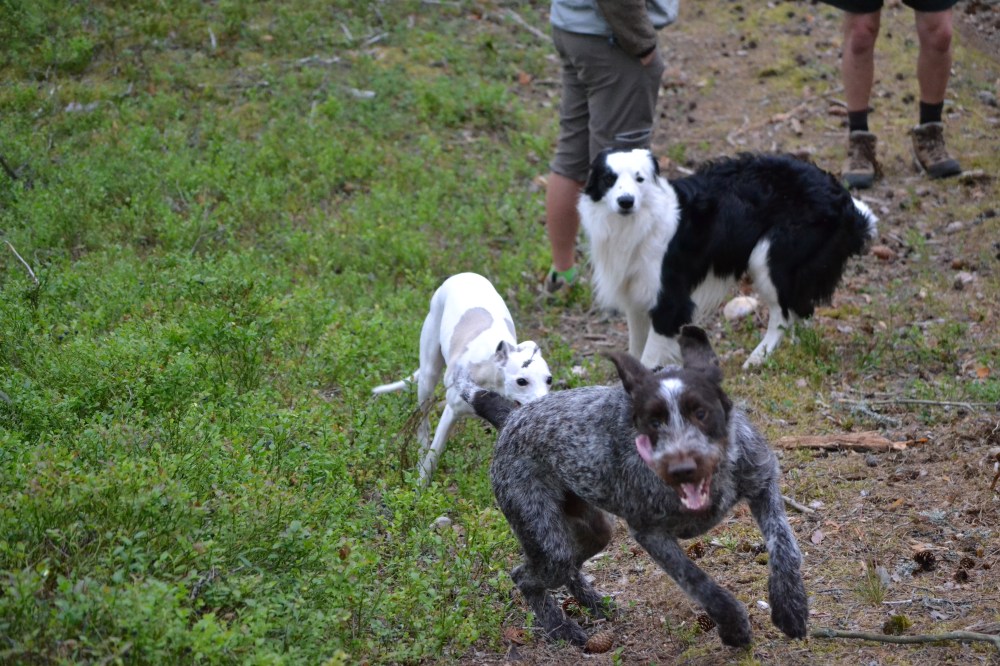 I söndags styrde vi bilen mot Västerfärnebo för att hälsa på Dick och Mayvor och träna lite hund ihop med dem. Och tränat fick vi! Uppletande med mycket gömda föremål i blåbärsris var svårt för pojkarna, men de lärde sig snabbt faktiskt. Sen blev det lydnadsträning och Tvebak fick ligga en plats med två BC-damer, varav den ena löpte! Han låg som klistrad i backen i 4 minuter! Kanske för att Martina plötsligt dök upp från skogen bakom honom efter en minut, vilken chock för stackars Tvebak som nu lärt sig att Martina inte tycker om när han kliar skägget eller för den sakens skull, kliar hela ryggen på platsliggningen. Sen att Martina denna gången bara skulle gå och ge godis till den löpande BC-tiken, det visste ju inte Tvebak.