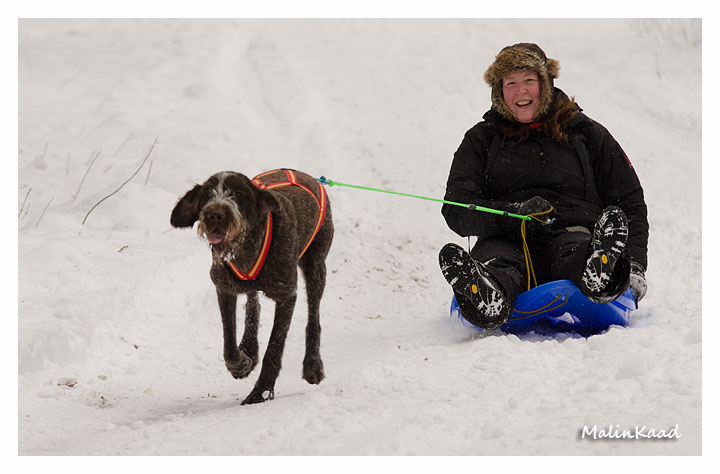 Vi övade lite drag redan i lördags….inte helt rätt teknik att binda fast hunden i midjan, men eftesom dragexperten först kopplades in på söndagen, testade vi så här i lördags. Inte helt lätt att åka såhär särskilt som det gärna går undan bakom Tvebak! Inte lätt för stackars Martina att fota heller, det är självklart Martina som tagit bilden och inte jag!