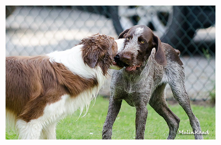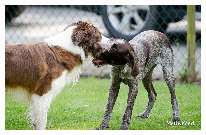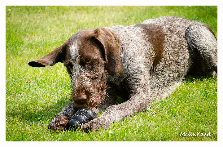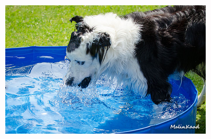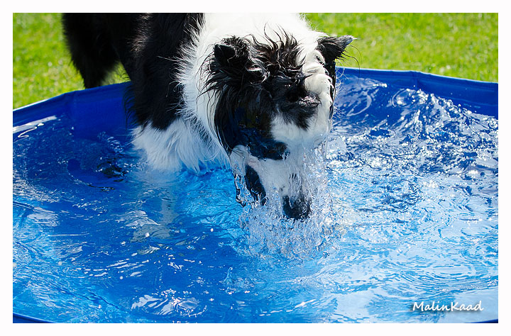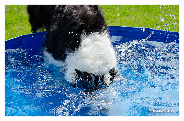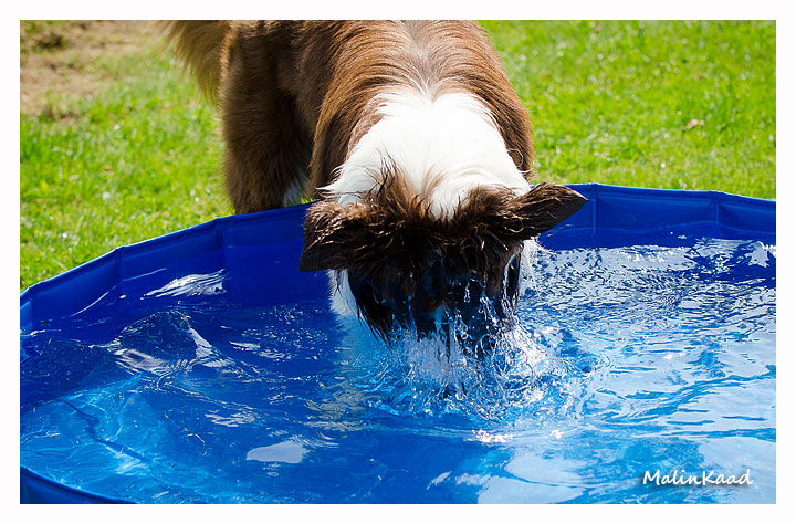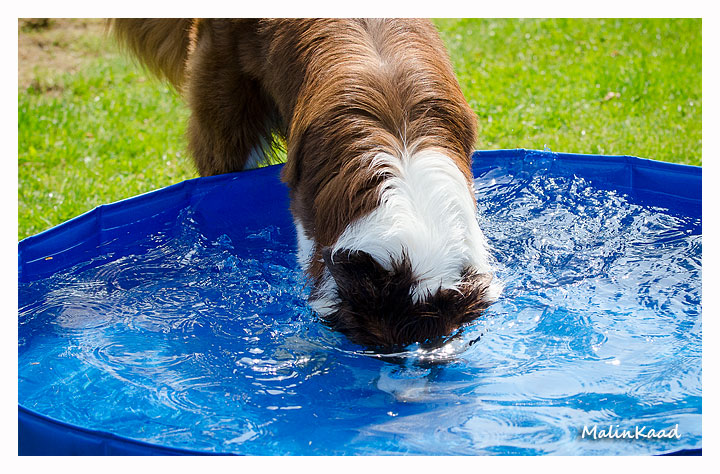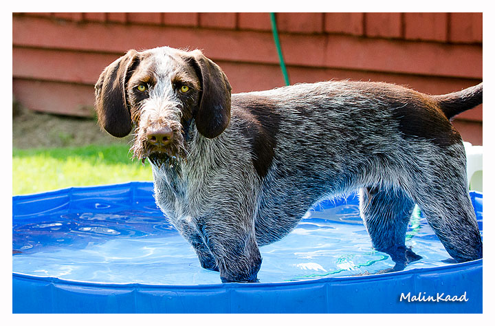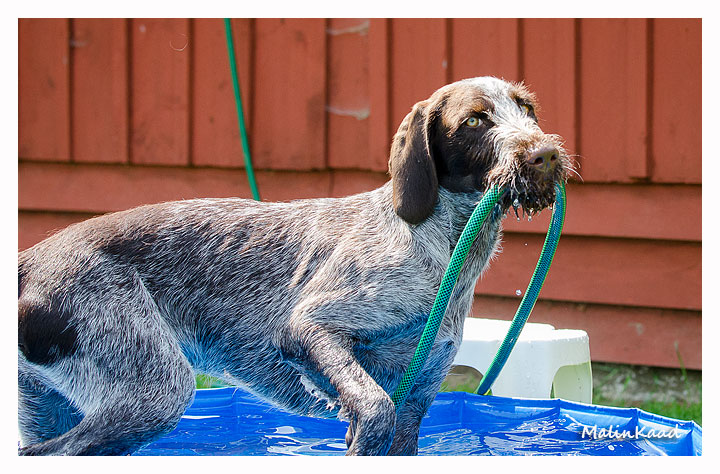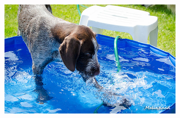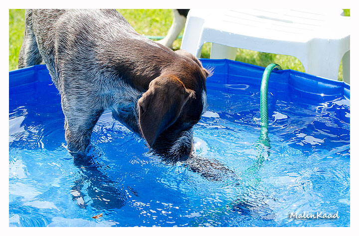 Igår var årets varmaste dag, 32 grader i skuggan det mesta av dagen. Holger tog fram vattenslangen och fyllde poolen, Rapp påstod sedan att det var hans pool men efter viss övertalning fick även andra låna poolen ibland. Är man en äldre vorstehherre, så bryr man sig inte om sådana banala lekar, därför syns Tvebak inte på bild.