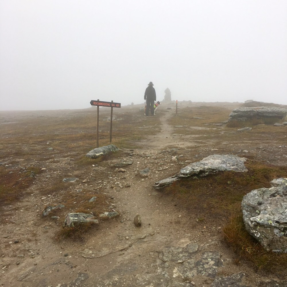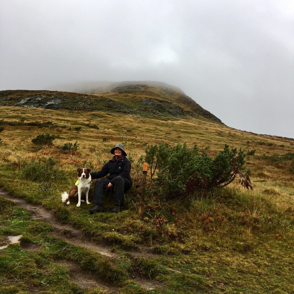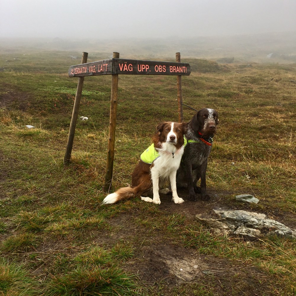 Idag regnade det friskt på förmiddagen. Vi drog på oss regnställ och lämnade finkameran hemma, inställda på att vyerna idag skulle vara begränsade. Positivt var dock att vi endast mötte två vandringssällskap, och de var på väg ner, när vi gick upp, så vi fick en rofylld vandring med Holger och Rapp på detta viset. För sju år sedan hade vi Camp och Tvebak med oss, de fick idag snällt vila i bilen. På detta viset kunde vi idag gå upp i vår egna takt, utan våra galningar som drog oss upp. Holger och Rapp är mycket lugnare att gå med när stigarna är smala, hala och branta. Vi valde dock den längre, mindre branta vägen upp, eftersom sikten var dålig och det kändes väl utmanande att gå ännu brantare än vi gjorde. Bergsgetterna Rapp och Holger var dock allt sugna på den branta sidan.