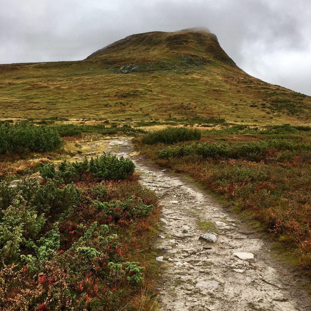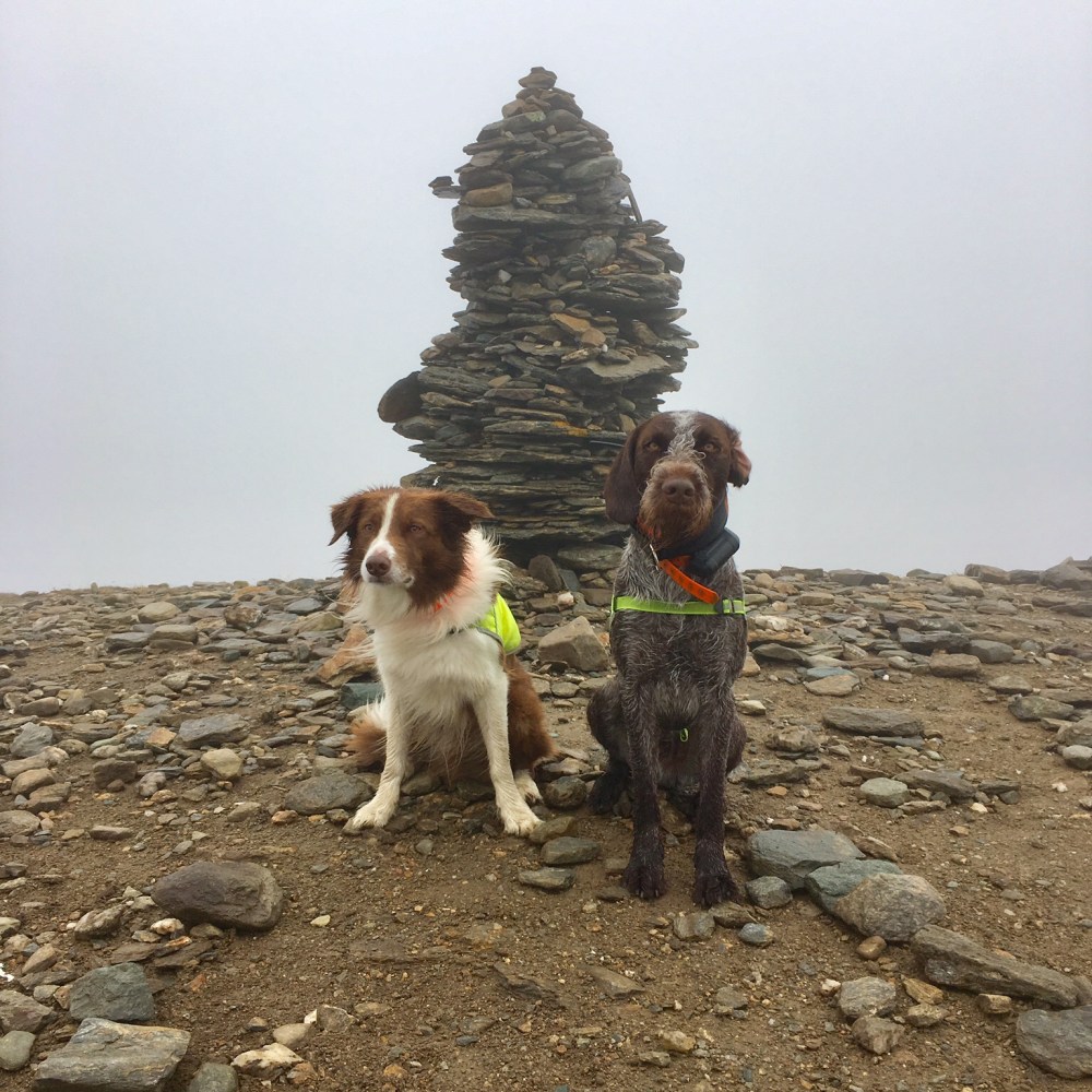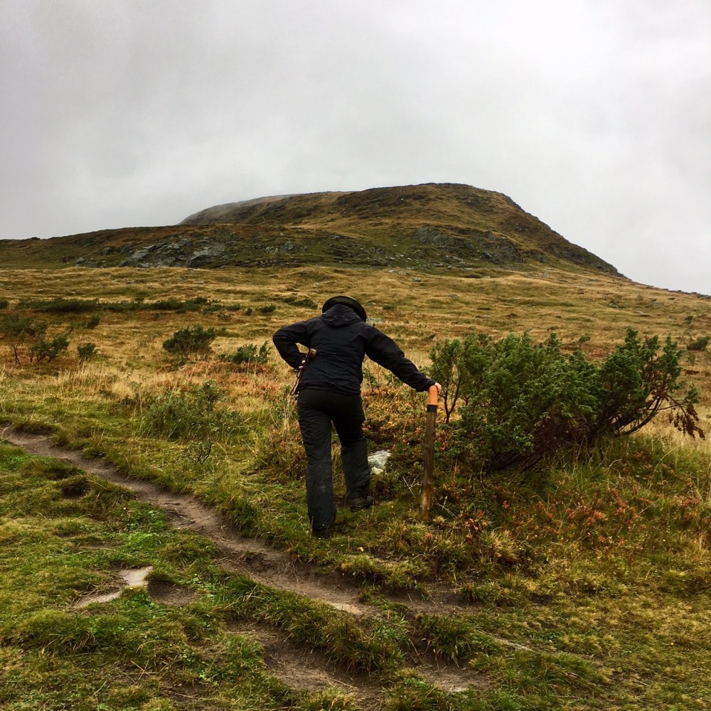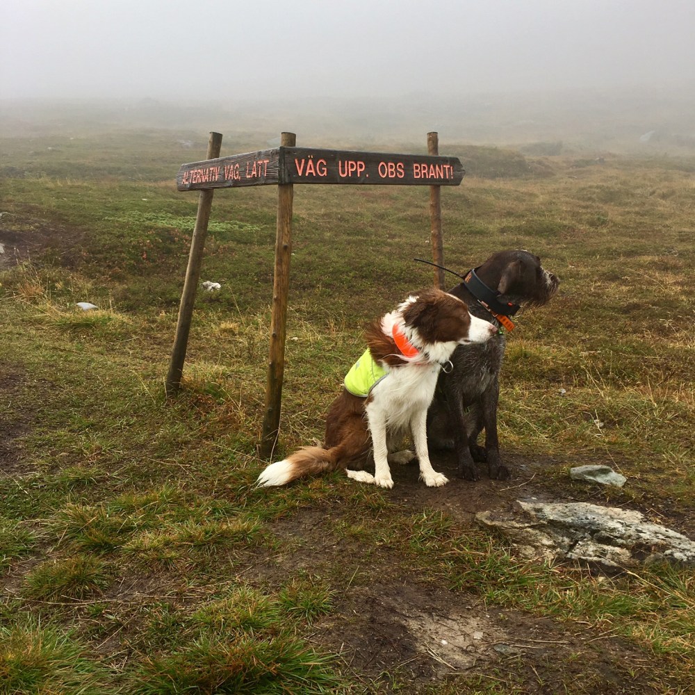 Idag regnade det friskt på förmiddagen. Vi drog på oss regnställ och lämnade finkameran hemma, inställda på att vyerna idag skulle vara begränsade. Positivt var dock att vi endast mötte två vandringssällskap, och de var på väg ner, när vi gick upp, så vi fick en rofylld vandring med Holger och Rapp på detta viset. För sju år sedan hade vi Camp och Tvebak med oss, de fick idag snällt vila i bilen. På detta viset kunde vi idag gå upp i vår egna takt, utan våra galningar som drog oss upp. Holger och Rapp är mycket lugnare att gå med när stigarna är smala, hala och branta. Vi valde dock den längre, mindre branta vägen upp, eftersom sikten var dålig och det kändes väl utmanande att gå ännu brantare än vi gjorde. Bergsgetterna Rapp och Holger var dock allt sugna på den branta sidan.