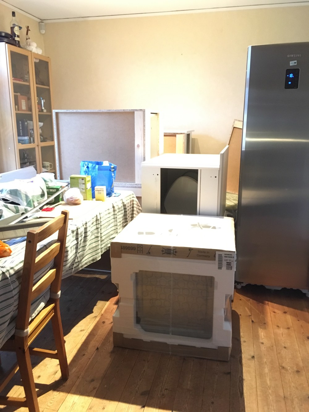 Idag kom köksutrustningen! Inte är det klart till att sätta in än, så allt står lavat i resten av huset. Vi är lite trångbodda, och lever på micro-mat, men allt har ett slut, så även denna renovering!