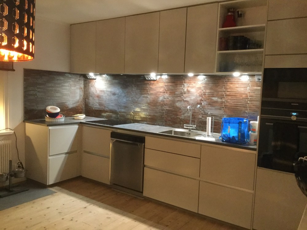 Idag hände det, vi har flyttat in i köket igen! Inte är vi helt färdiga än, men all kakel är nu på plats, fattas bara lite fog nederst, och sen ska såklart all kakel tvättas ren från fogrester. Från Kvick saknar vi ett par stora luckor, men den som väntar på något gott… sen fattas vi en list i köket från snickaren, och lite justering av köksluckorna när alla är på plats.