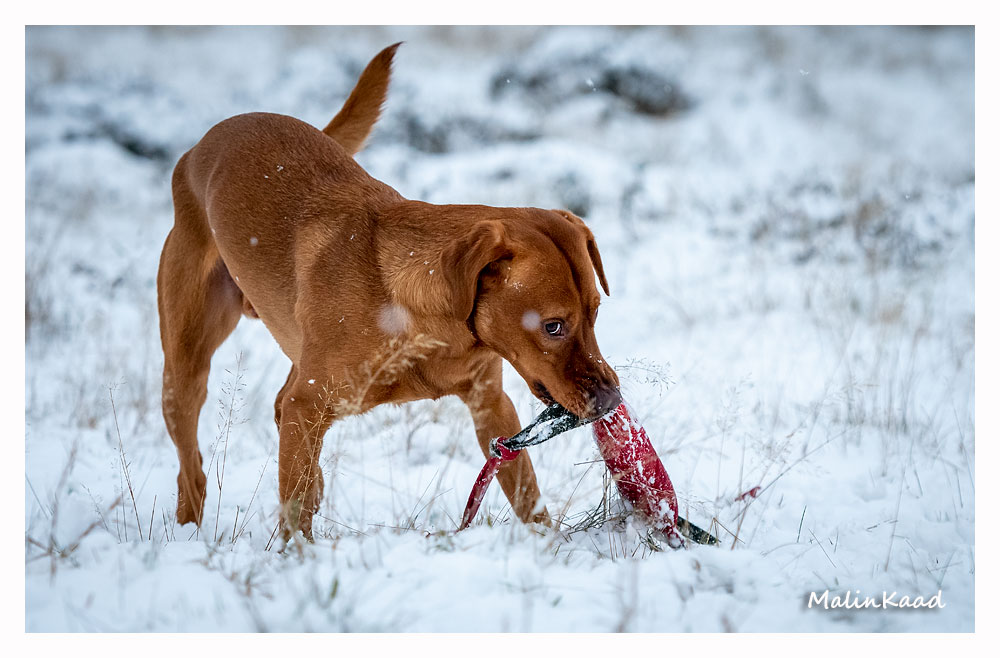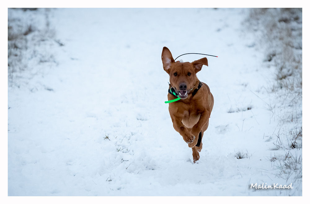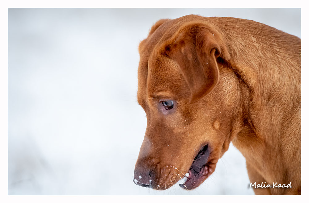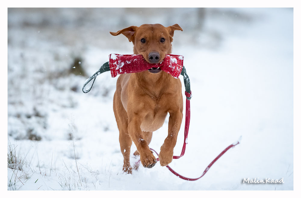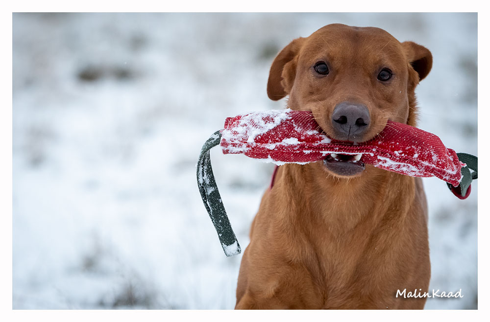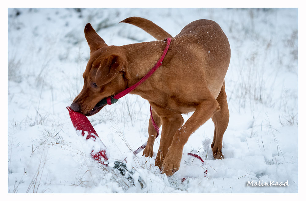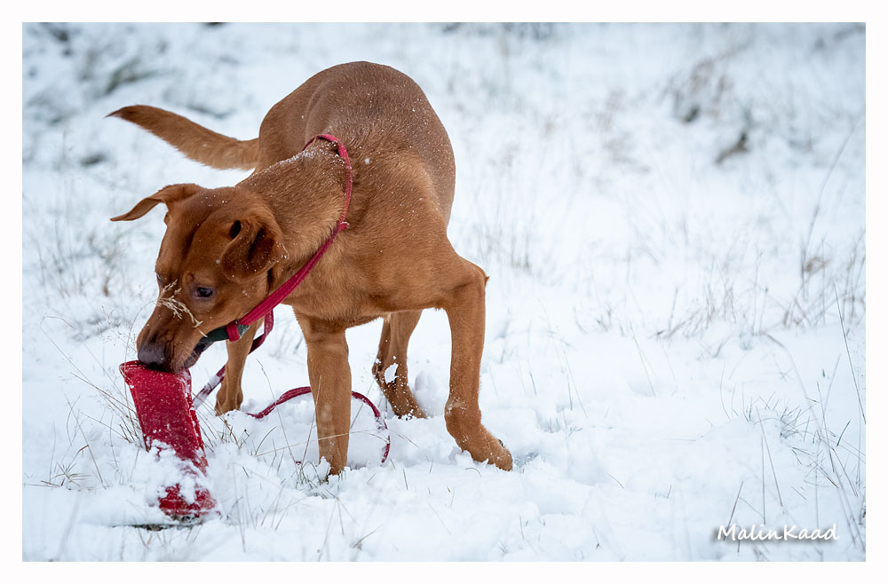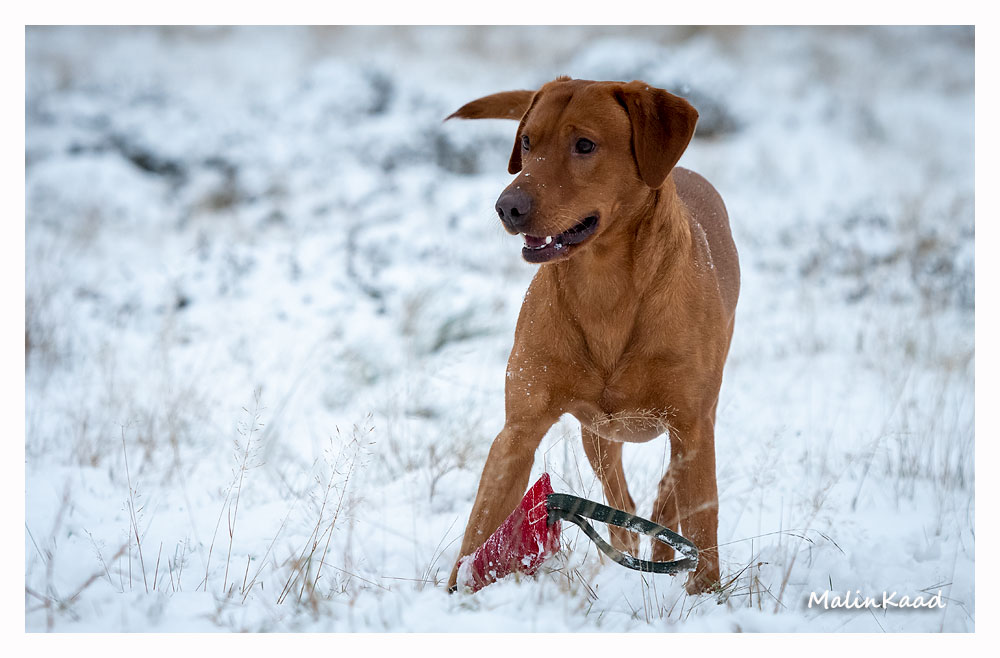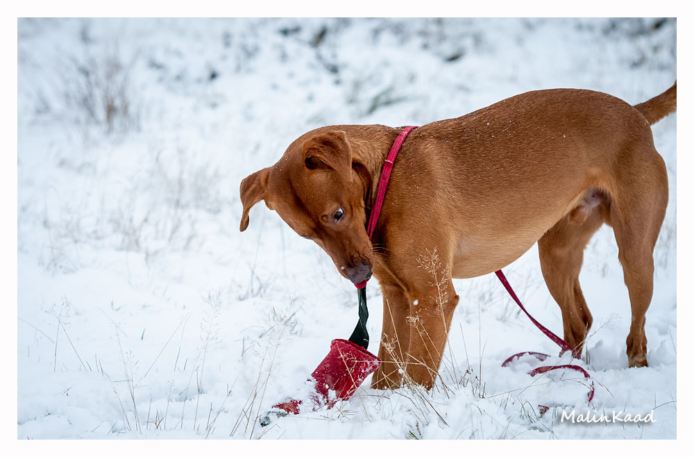 Drygt 21 månader gammal fick Guinness idag uppleva sin första riktiga snö. Först en snabb rapportträning, sen en massa bus i snön. Egentligen skulle Guinness även gå promenad med övriga flocken, men då lille herren passade på att öva sig på vinterbad, hamnade han i bilen med tjockt täcke på istället.