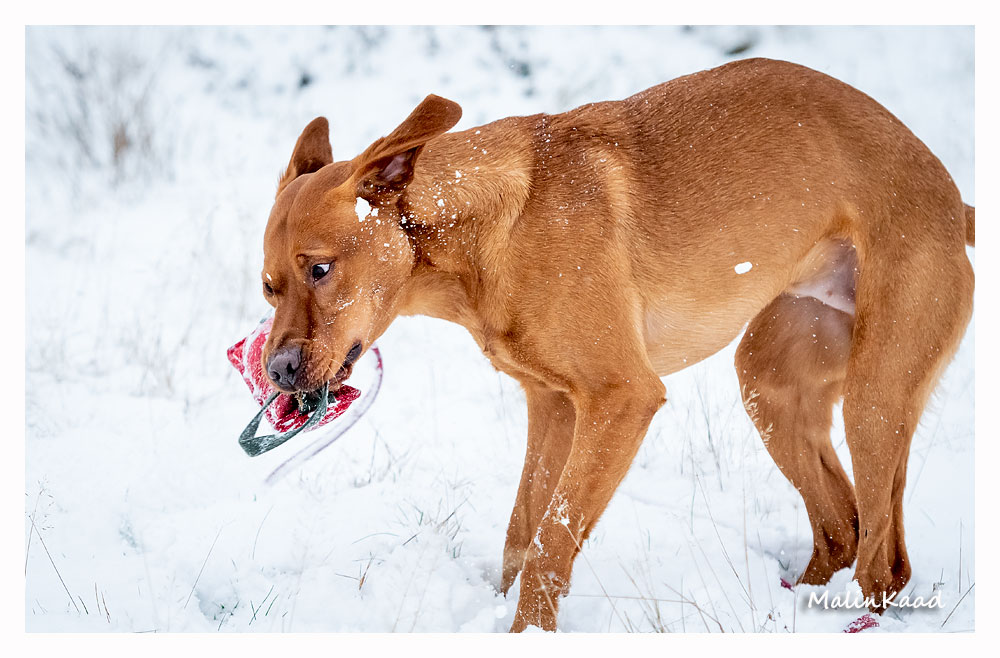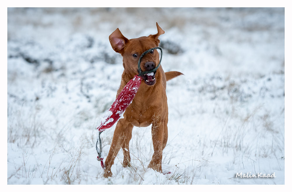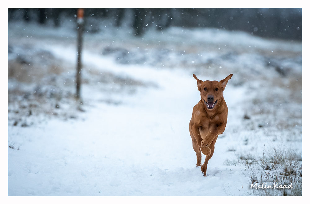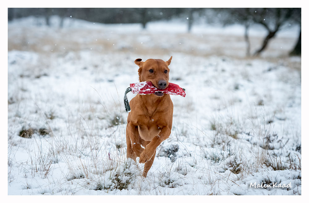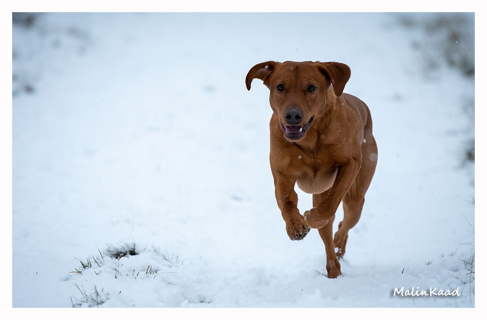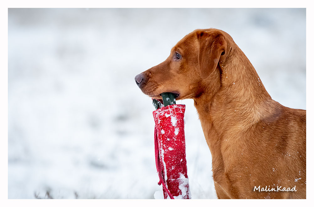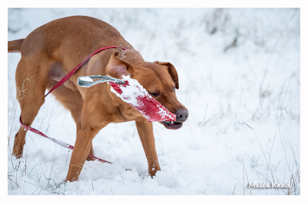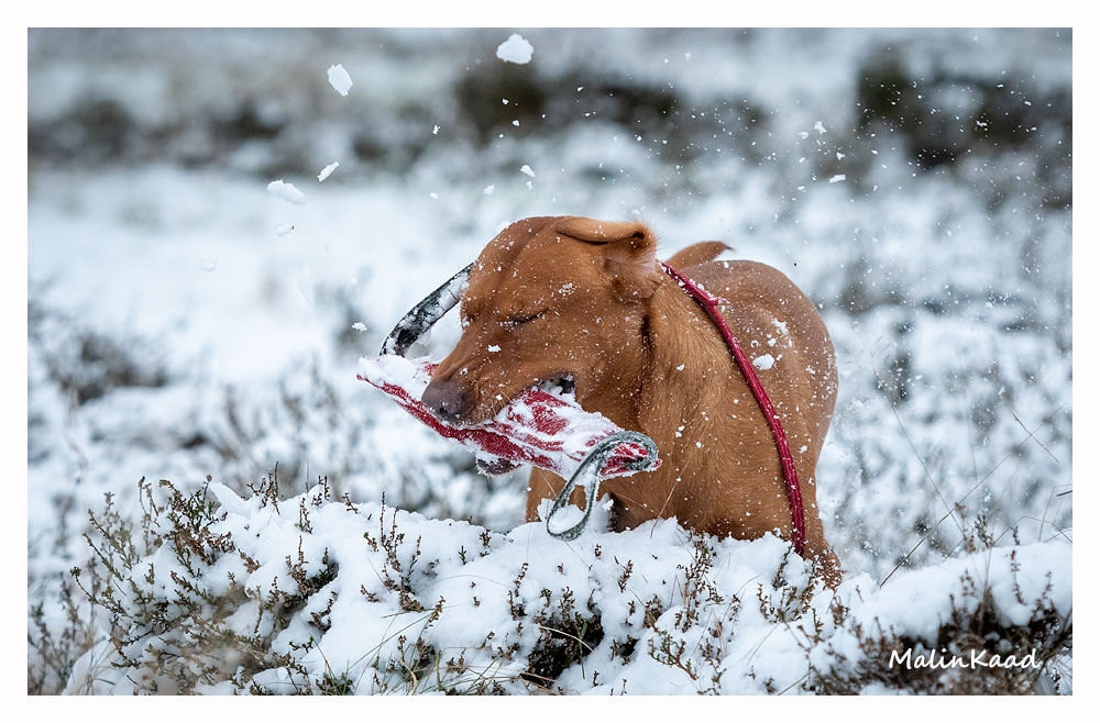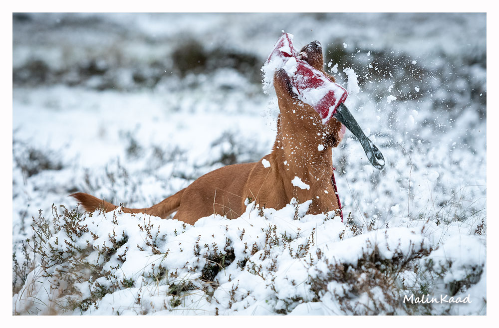 Drygt 21 månader gammal fick Guinness idag uppleva sin första riktiga snö. Först en snabb rapportträning, sen en massa bus i snön. Egentligen skulle Guinness även gå promenad med övriga flocken, men då lille herren passade på att öva sig på vinterbad, hamnade han i bilen med tjockt täcke på istället.