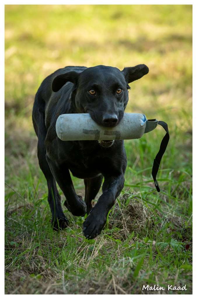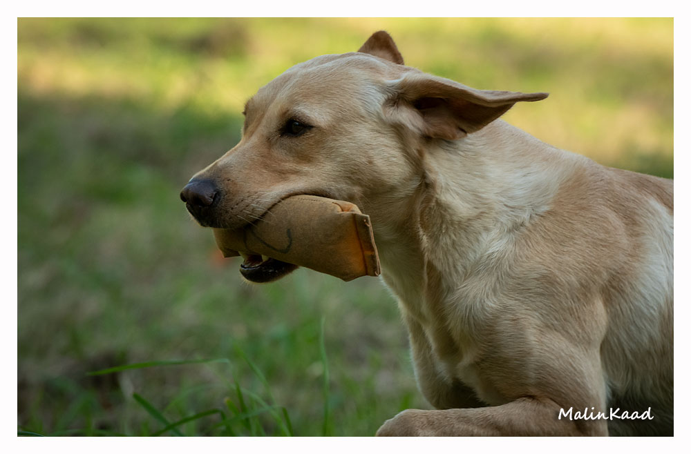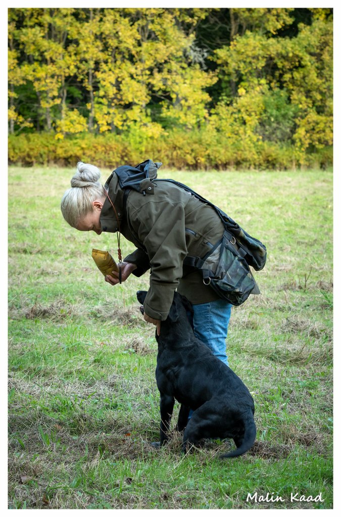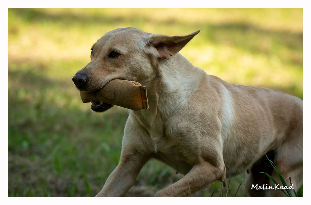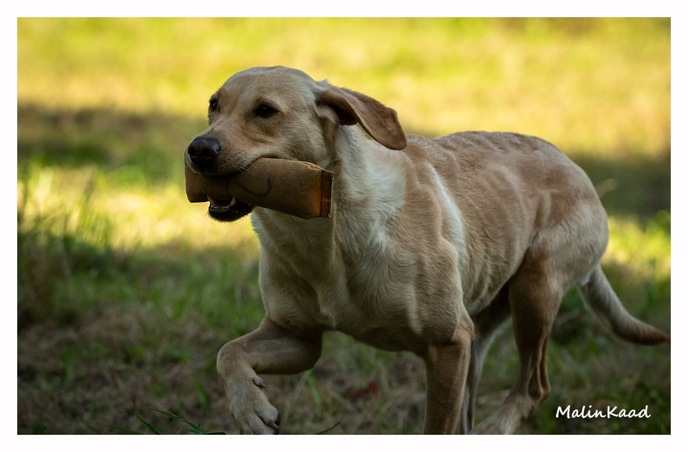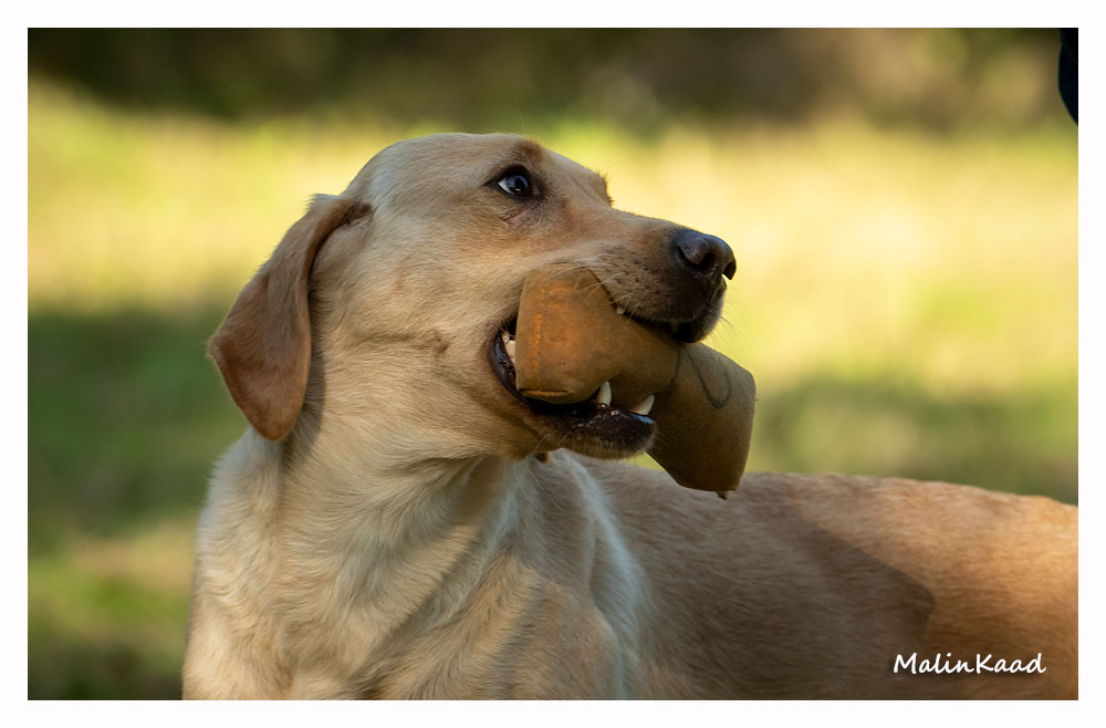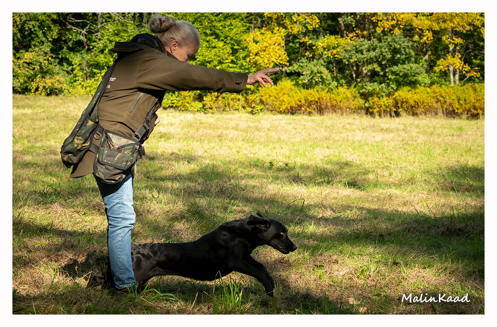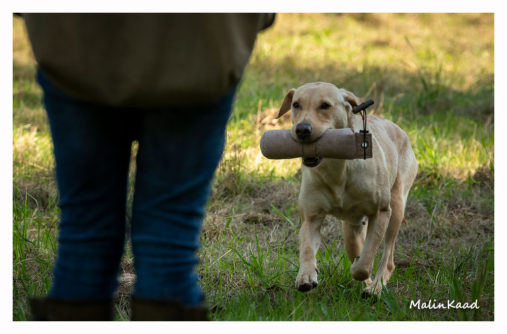Apporteringsträning med Guinness, Guinness mamma Tjockis (gul) som förs av uppfödaren Lotte, samt Londons mamma Nellie (svart) som förs av Annette för första gången.