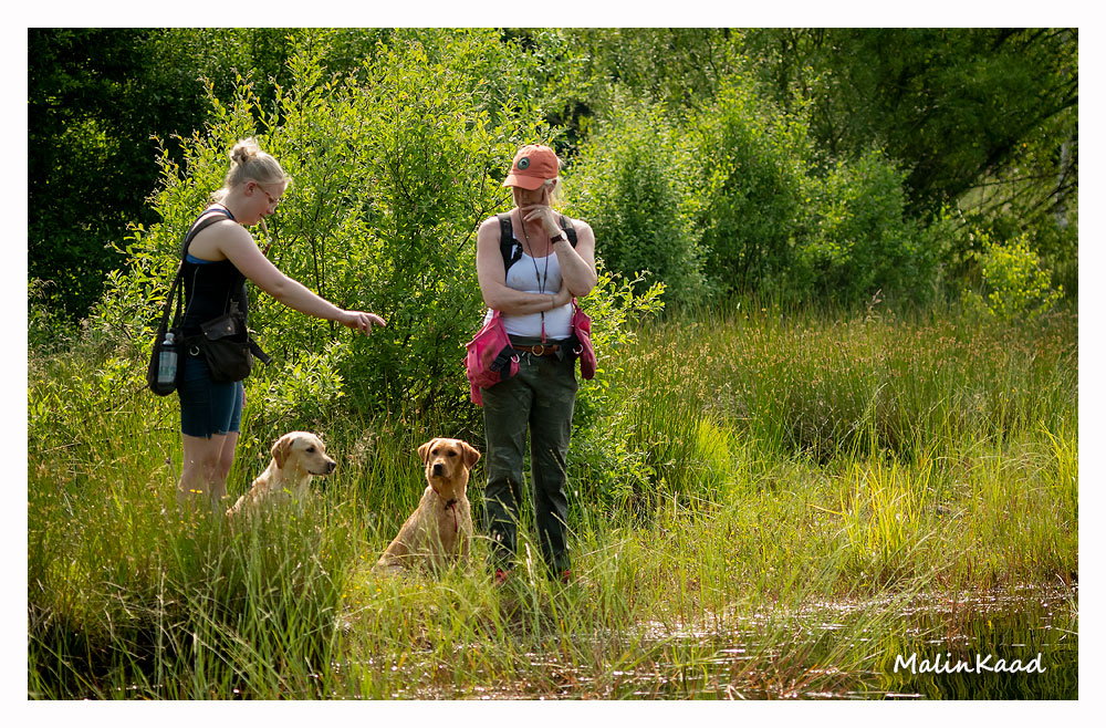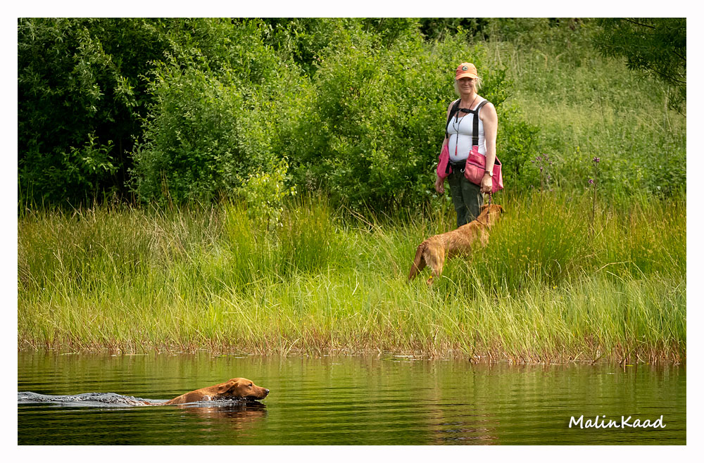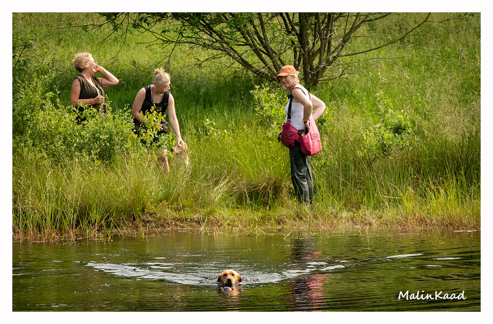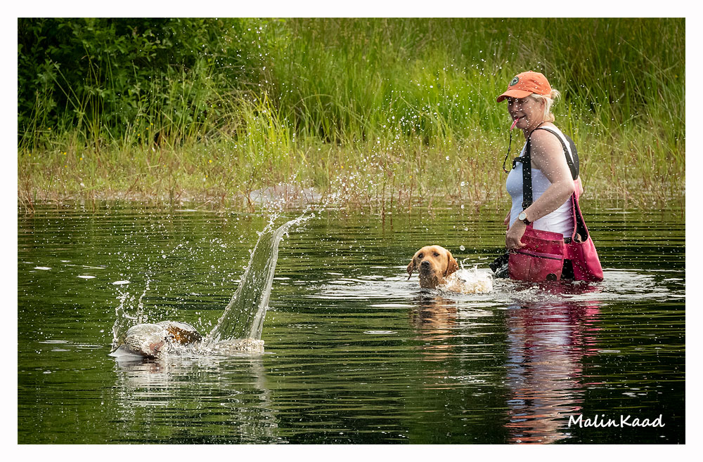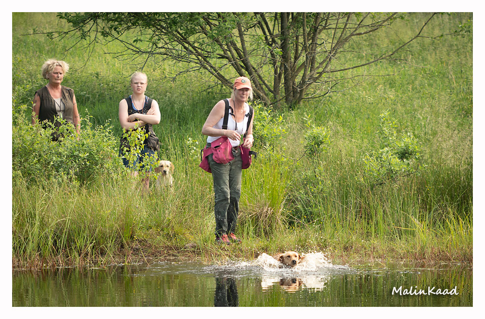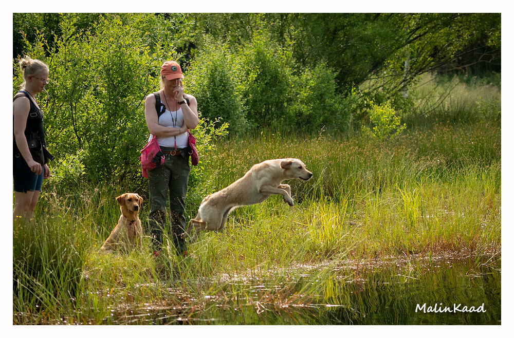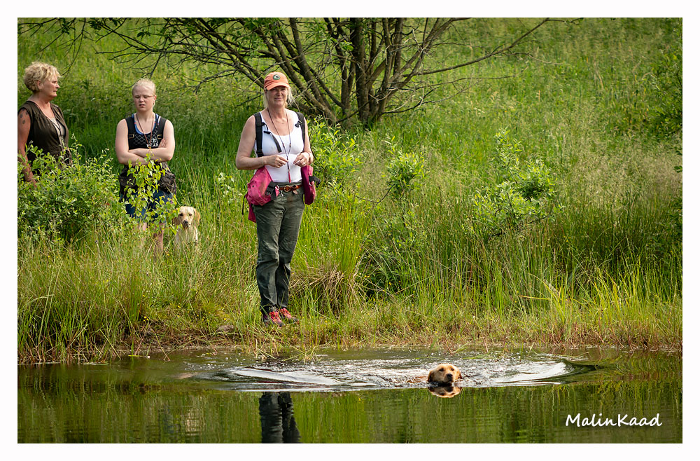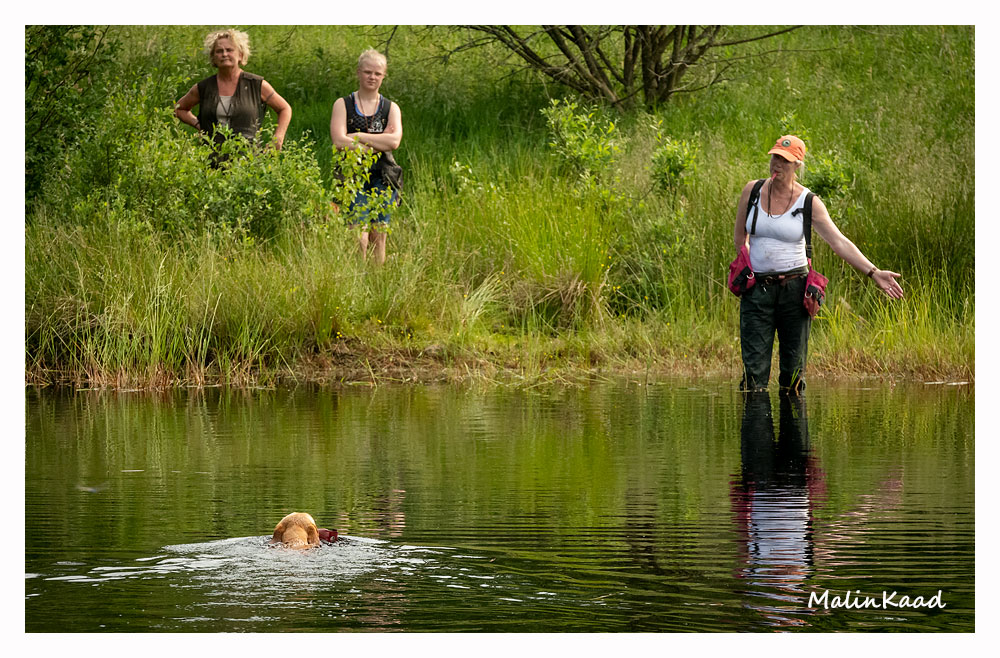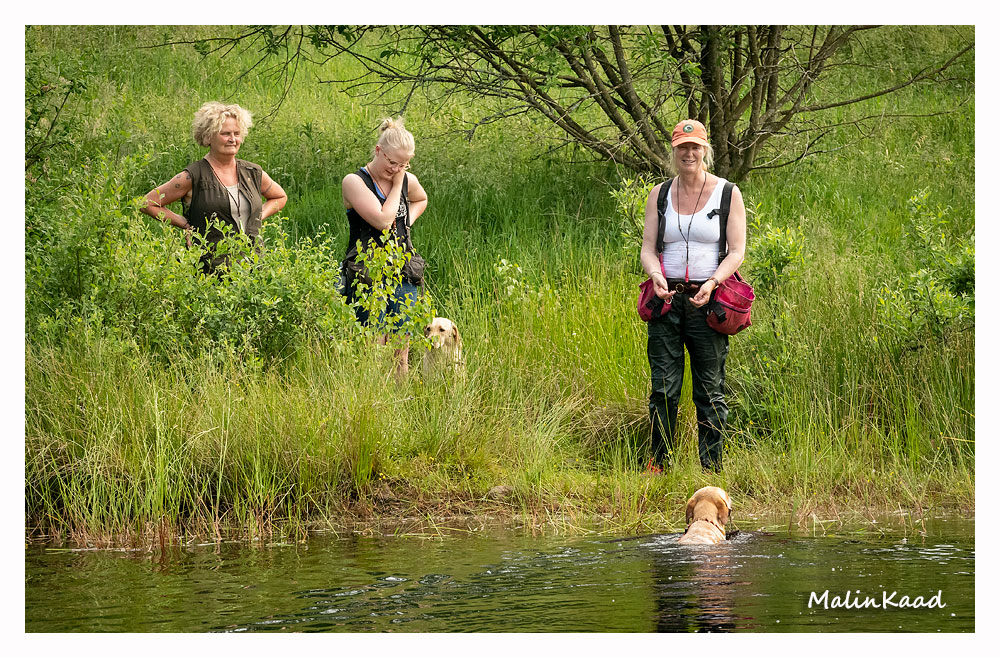 Den 20 juni i år var en varm dag så Martina, Lotte och Johanna tränade vattenapportering med Guinness, Jodi, Uny och Ila vid ”Kalles damm”,