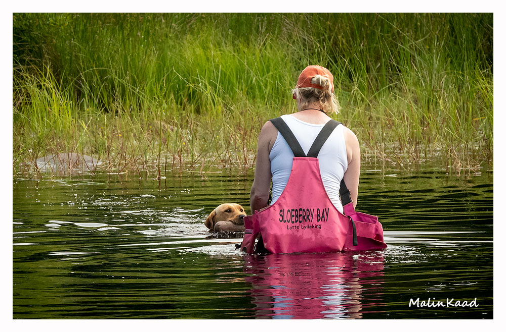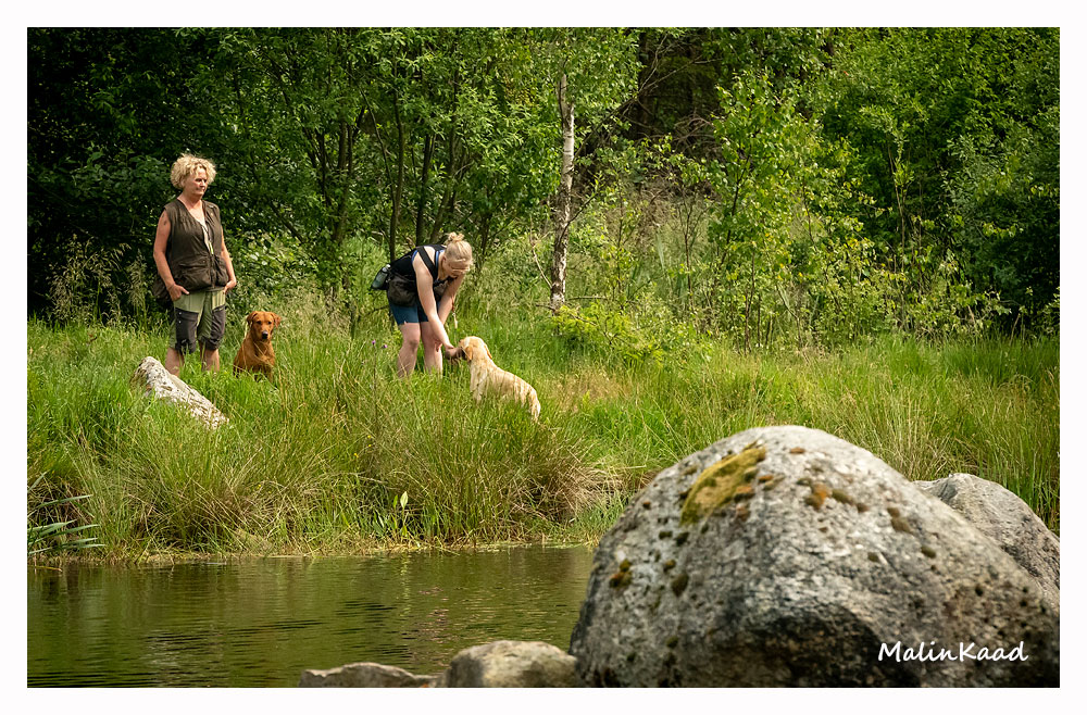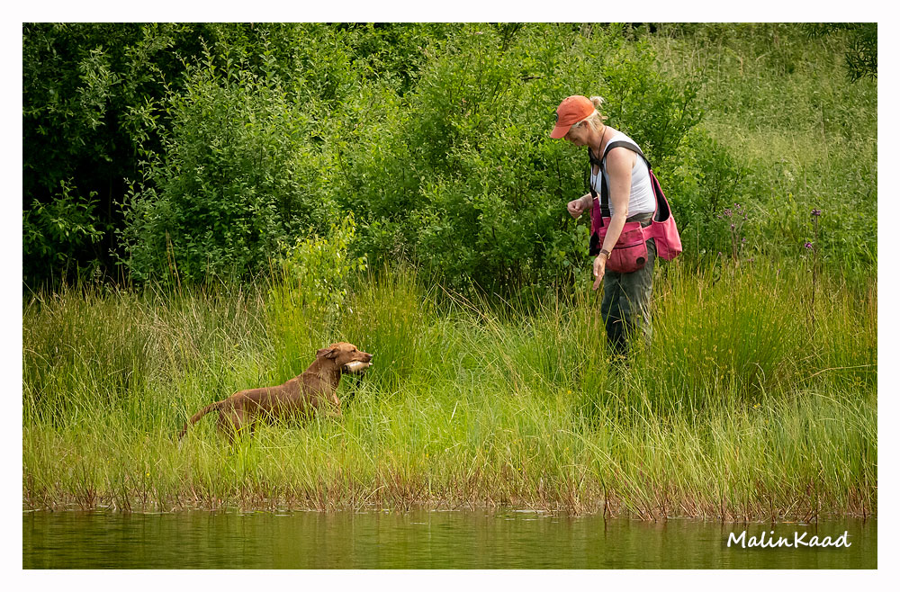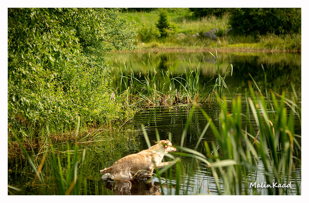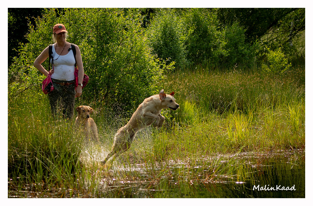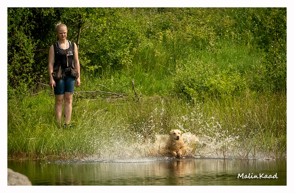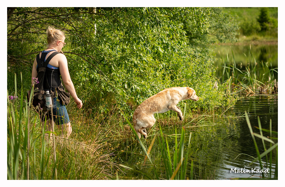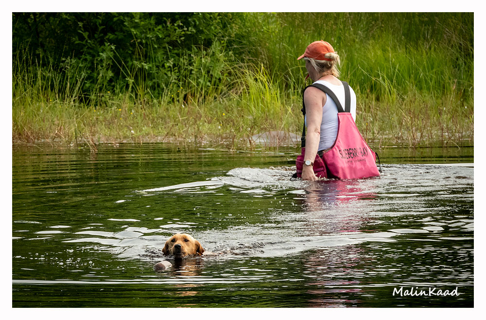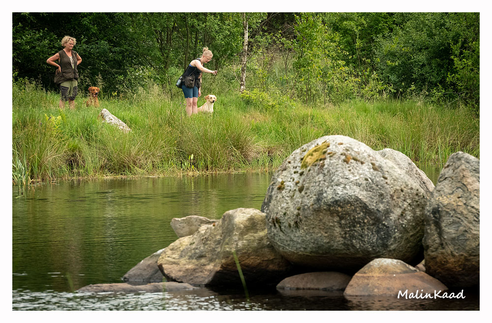 Den 20 juni i år var en varm dag så Martina, Lotte och Johanna tränade vattenapportering med Guinness, Jodi, Uny och Ila vid ”Kalles damm”,