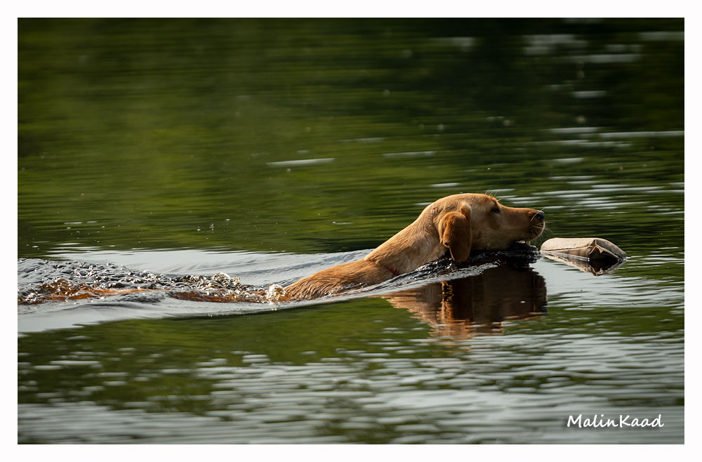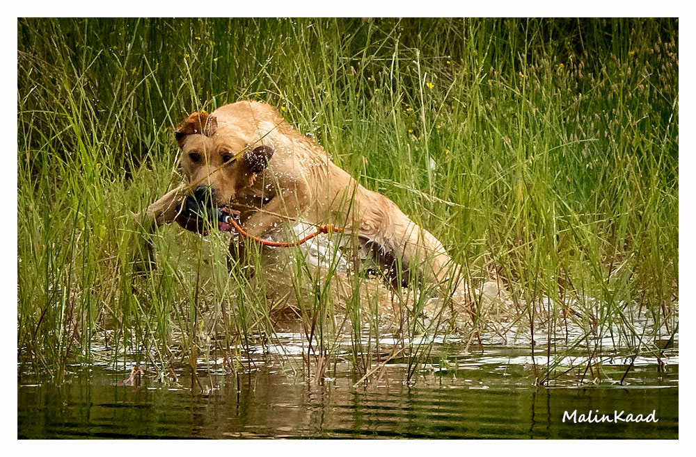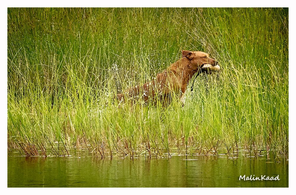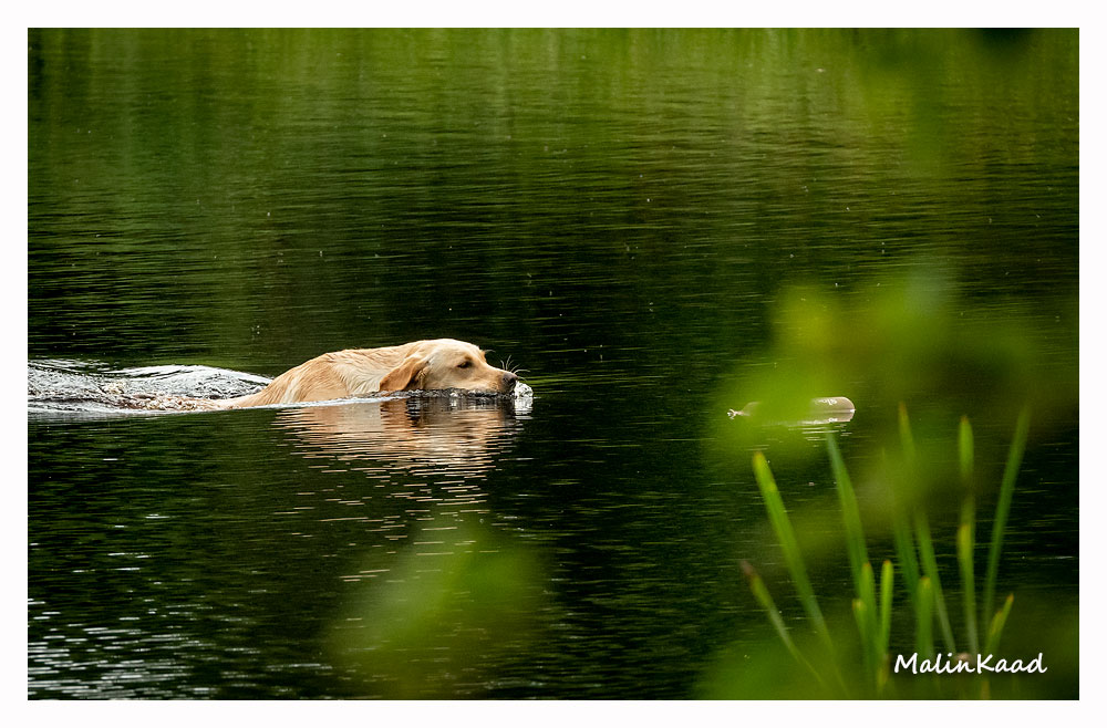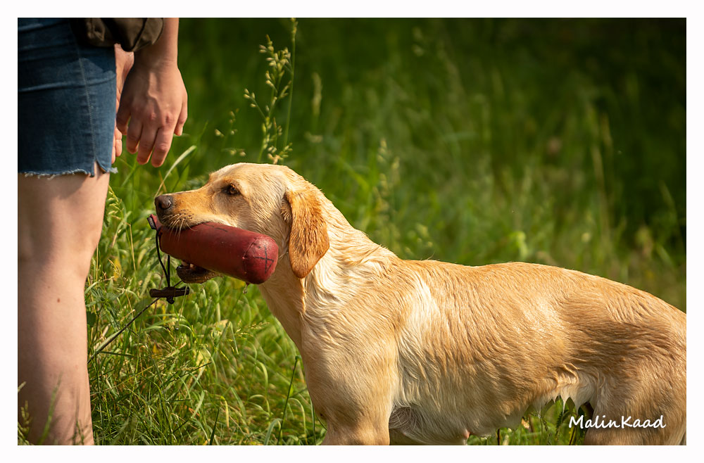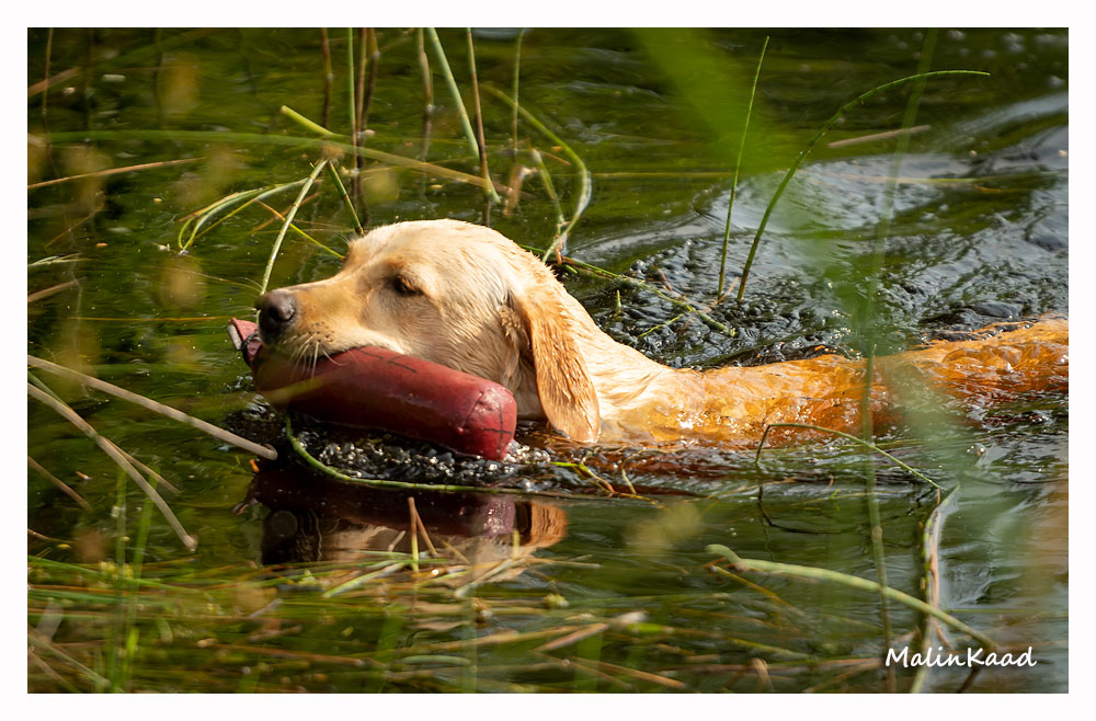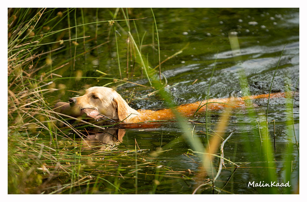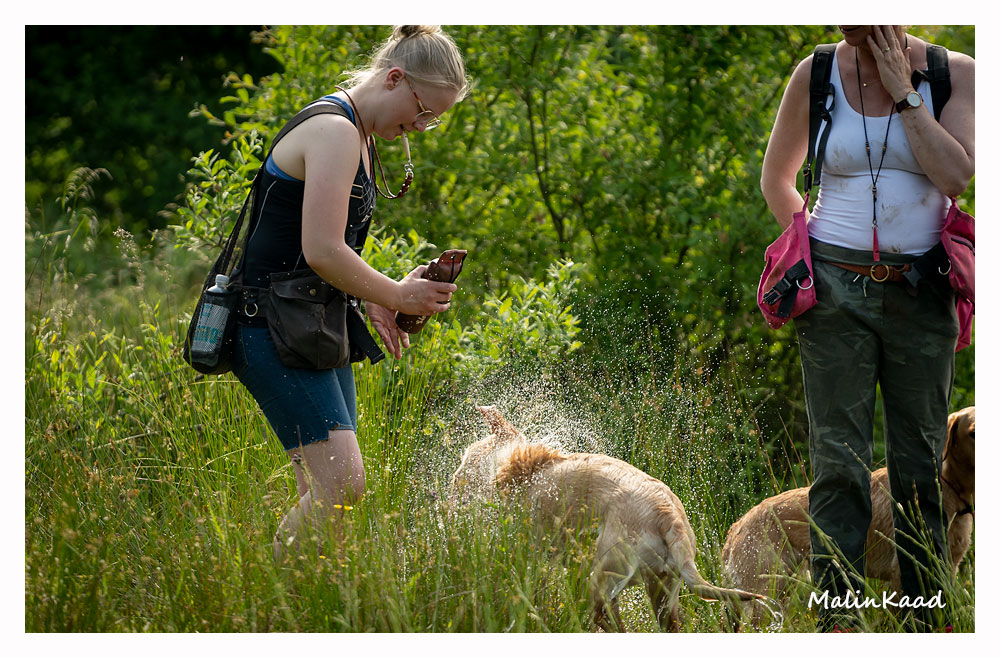 Den 20 juni i år var en varm dag så Martina, Lotte och Johanna tränade vattenapportering med Guinness, Jodi, Uny och Ila vid ”Kalles damm”,