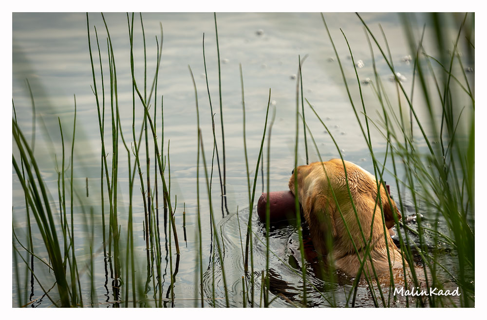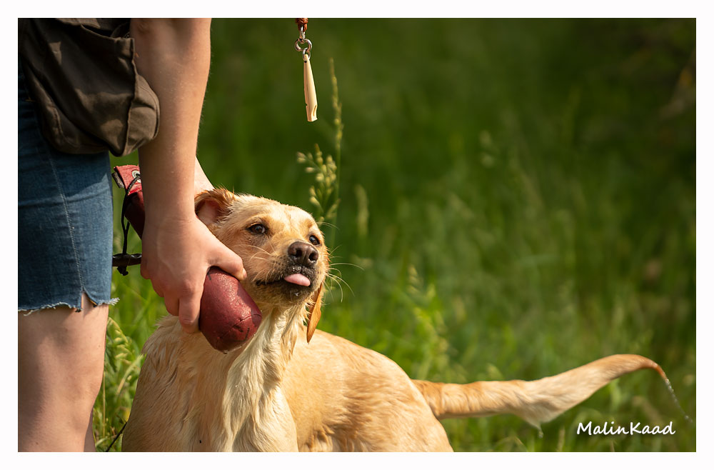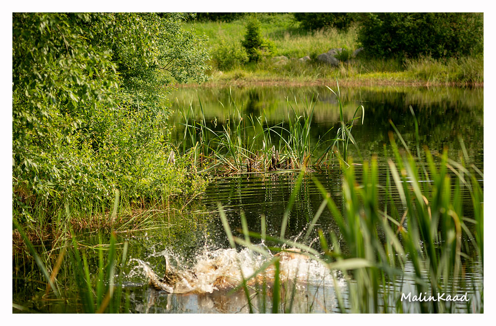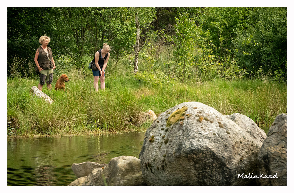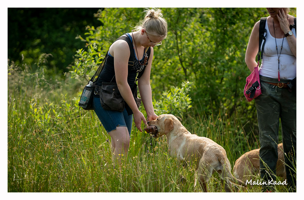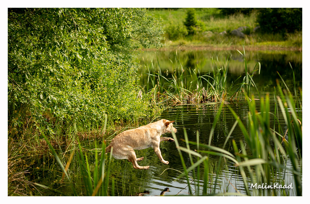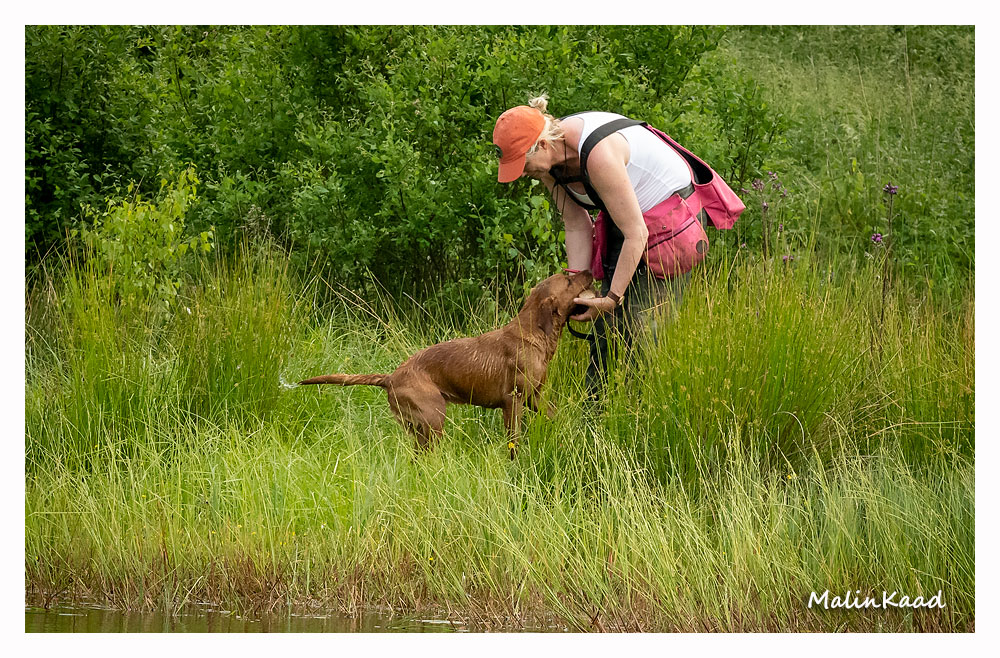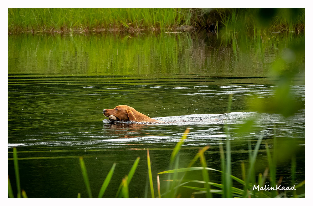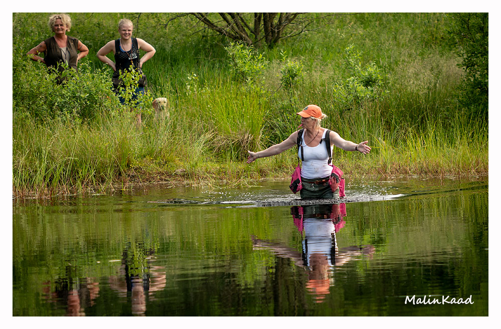 Den 20 juni i år var en varm dag så Martina, Lotte och Johanna tränade vattenapportering med Guinness, Jodi, Uny och Ila vid ”Kalles damm”,