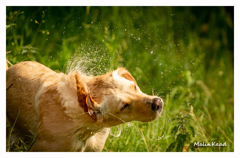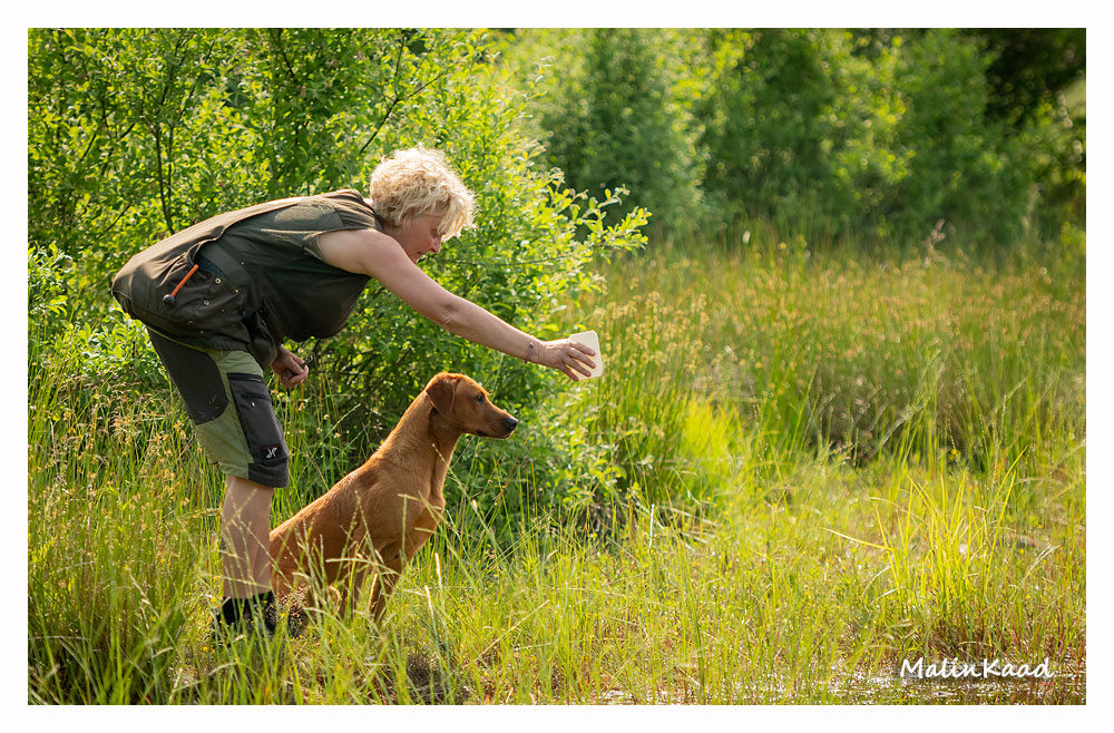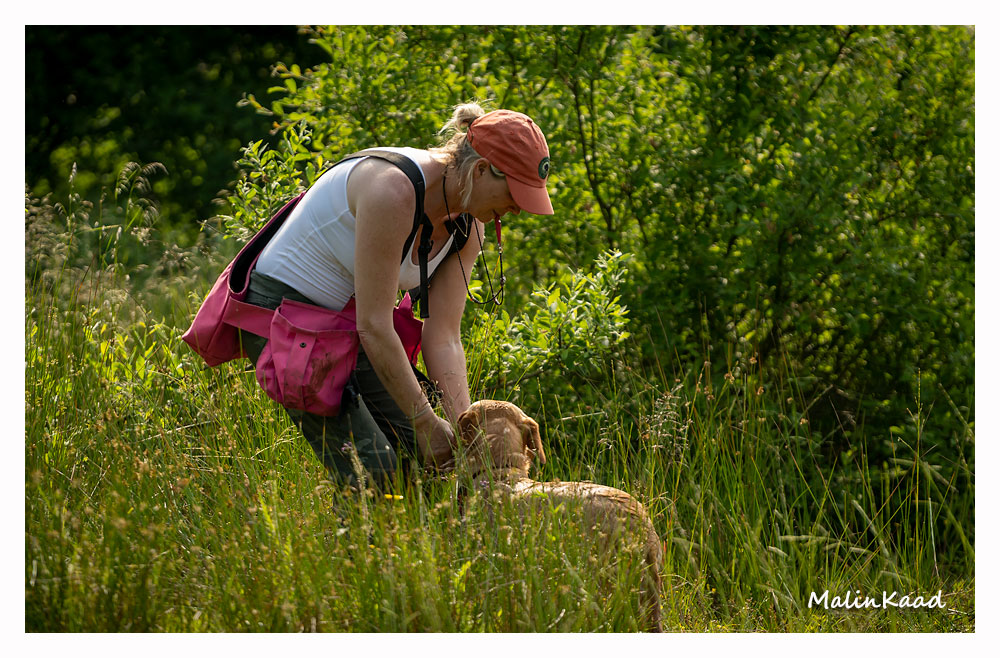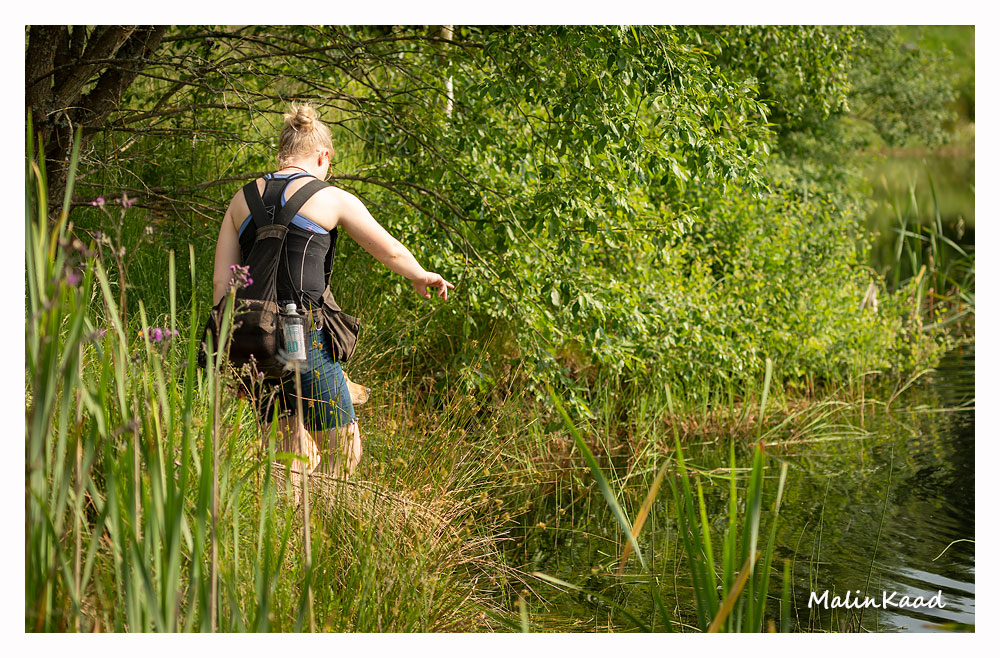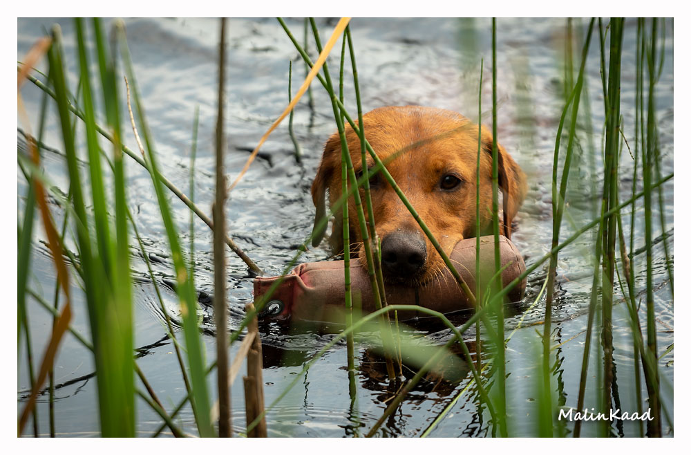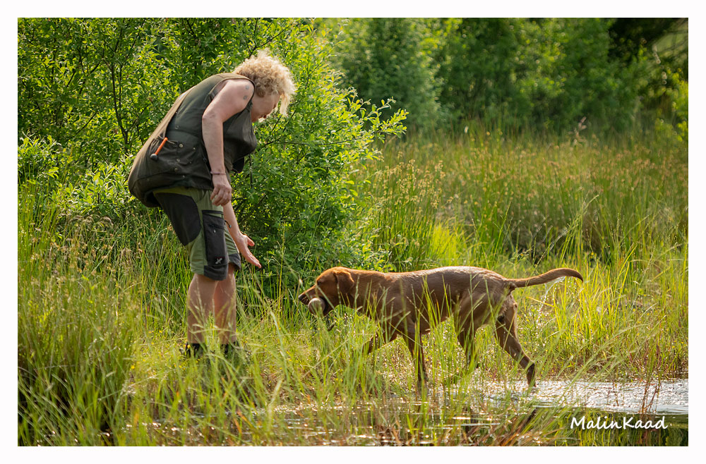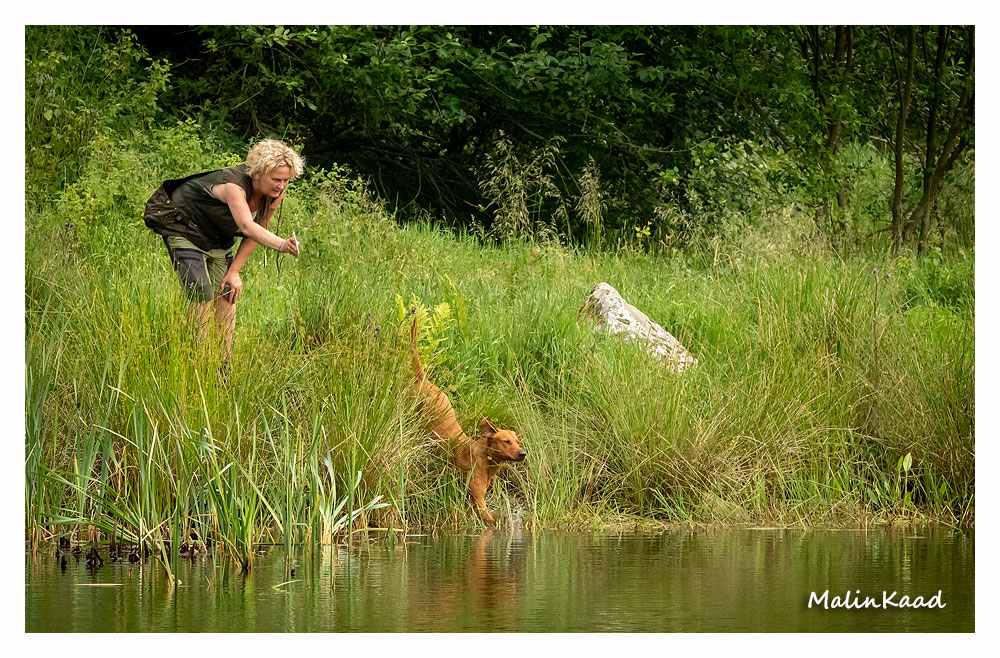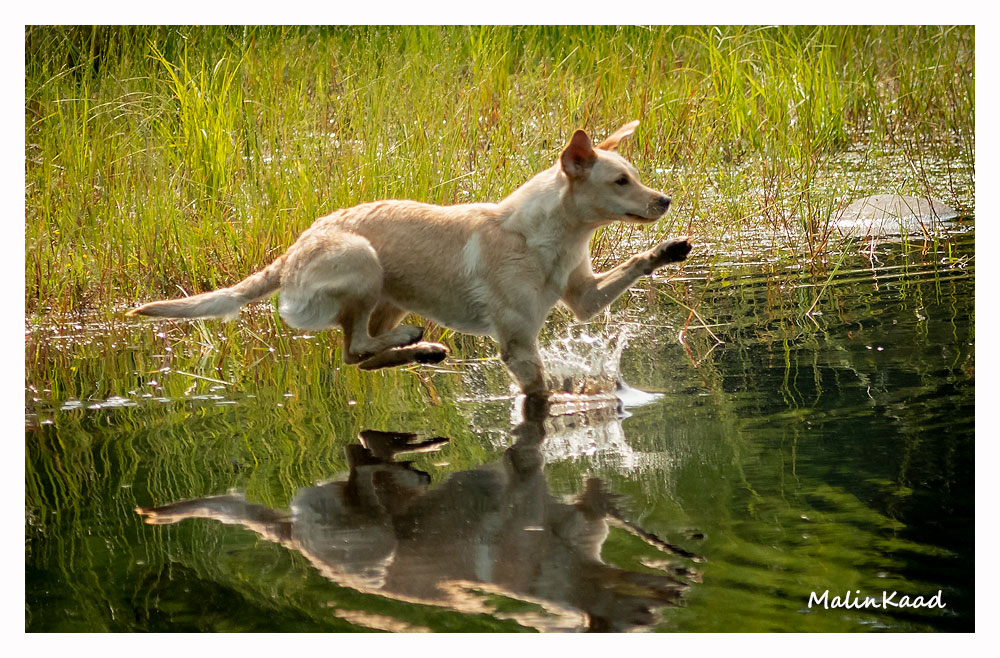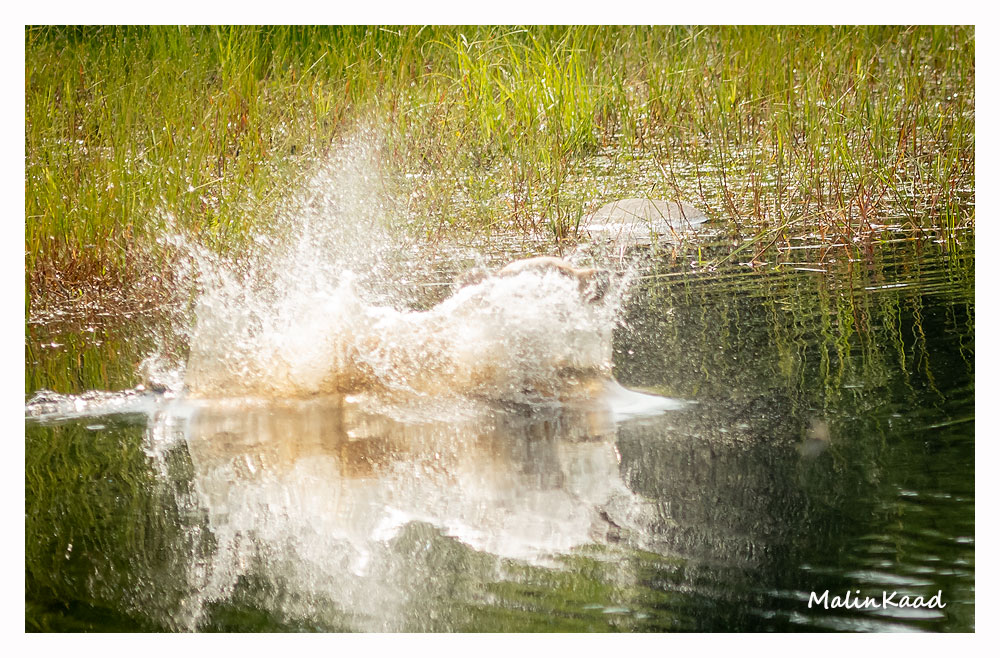 Den 20 juni i år var en varm dag så Martina, Lotte och Johanna tränade vattenapportering med Guinness, Jodi, Uny och Ila vid ”Kalles damm”,